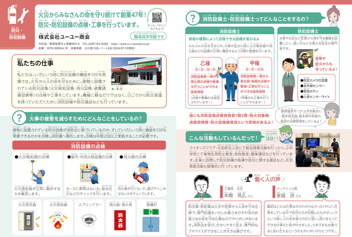 弊社は防災事業で、火災からお客様の生命・財産等を守ることを通じて、地域の発展に貢献することを目的に創業時から事業を展開しています。「安全」「快適」「信頼」を理念に掲げ、防災・防犯設備のコンサルタント企業を目指して、消防設備士や防犯設備士などの資格を社員全員が積極的に取得し、さらに上の防災・防犯アドバイザーの確立に向けて、日々努力しているところです。今、大切なのは一人でも多くの方が「防災・防犯意識」を持つことであり、積極的に防災訓練や防犯訓練の推進を行い、さらにお客様のお役に立てる企業を目指しております。